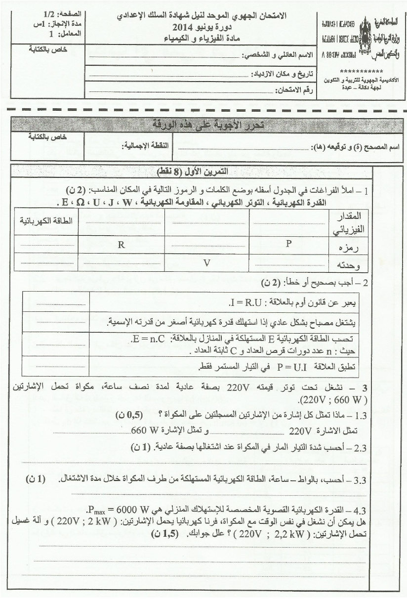 امتحانات : جهوي الفيزياء و الكمياء جهة دكالة 2014 | الثالثة إعدادي امتحانات الفيزياء للثالثة اعدادي 2015-06-13Mouad Lakrad
