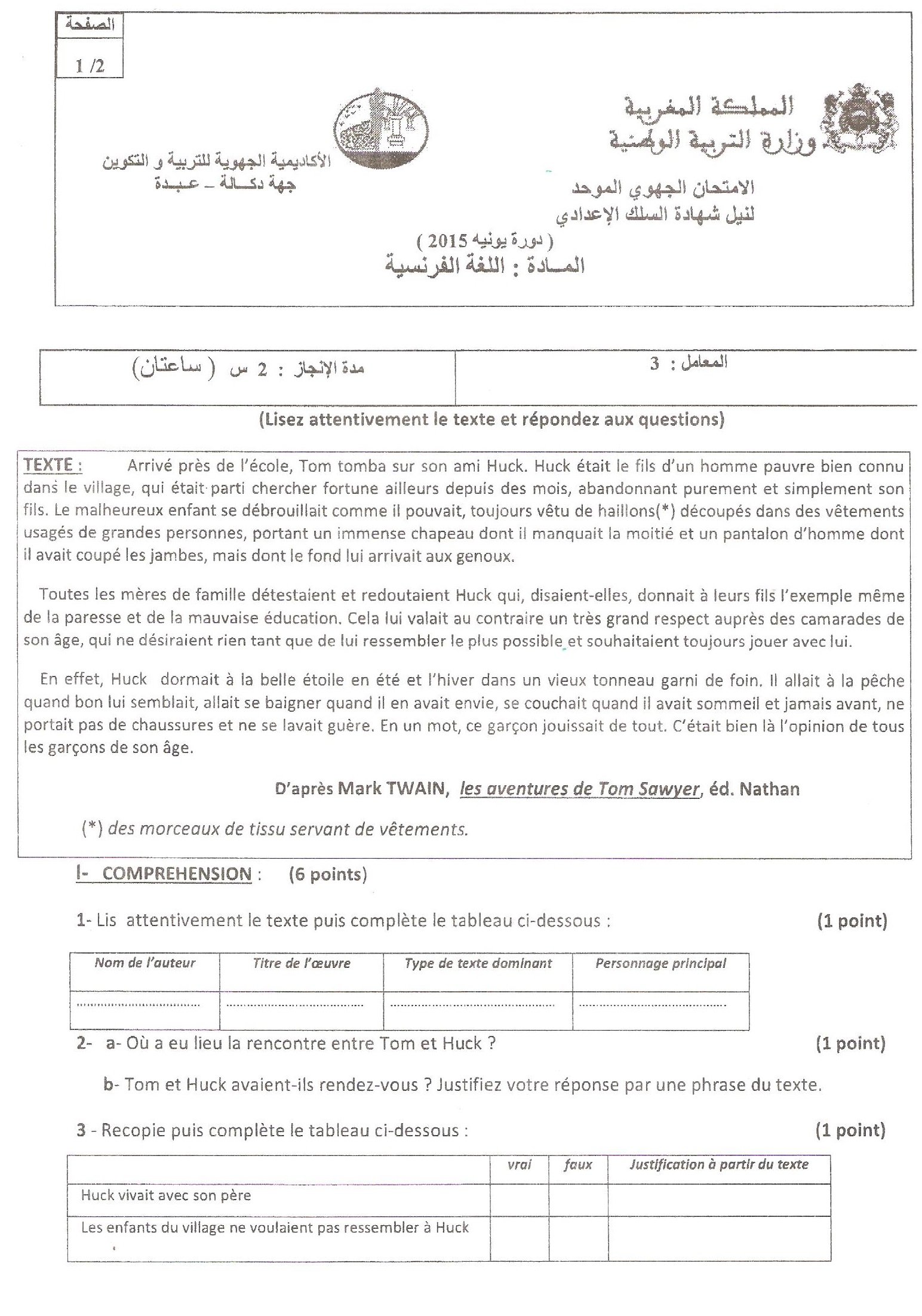 امتحانات : جهوي الفرنسية جهة دكالة 2015 | الثالثة إعدادي امتحانات جهوية للفرنسية الثالثة إعدادي 2015-06-20Mouad Lakrad