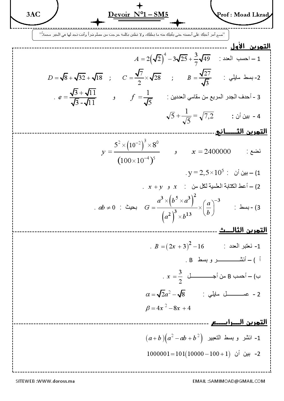 فروض : فرض منزلي 1 الدورة الأولى | الثالثة إعداديفروض منزلية للرياضيات الثالثة إعدادي فروض الرياضيات للثالثة إعدادي 2015-10-31Mouad Lakrad