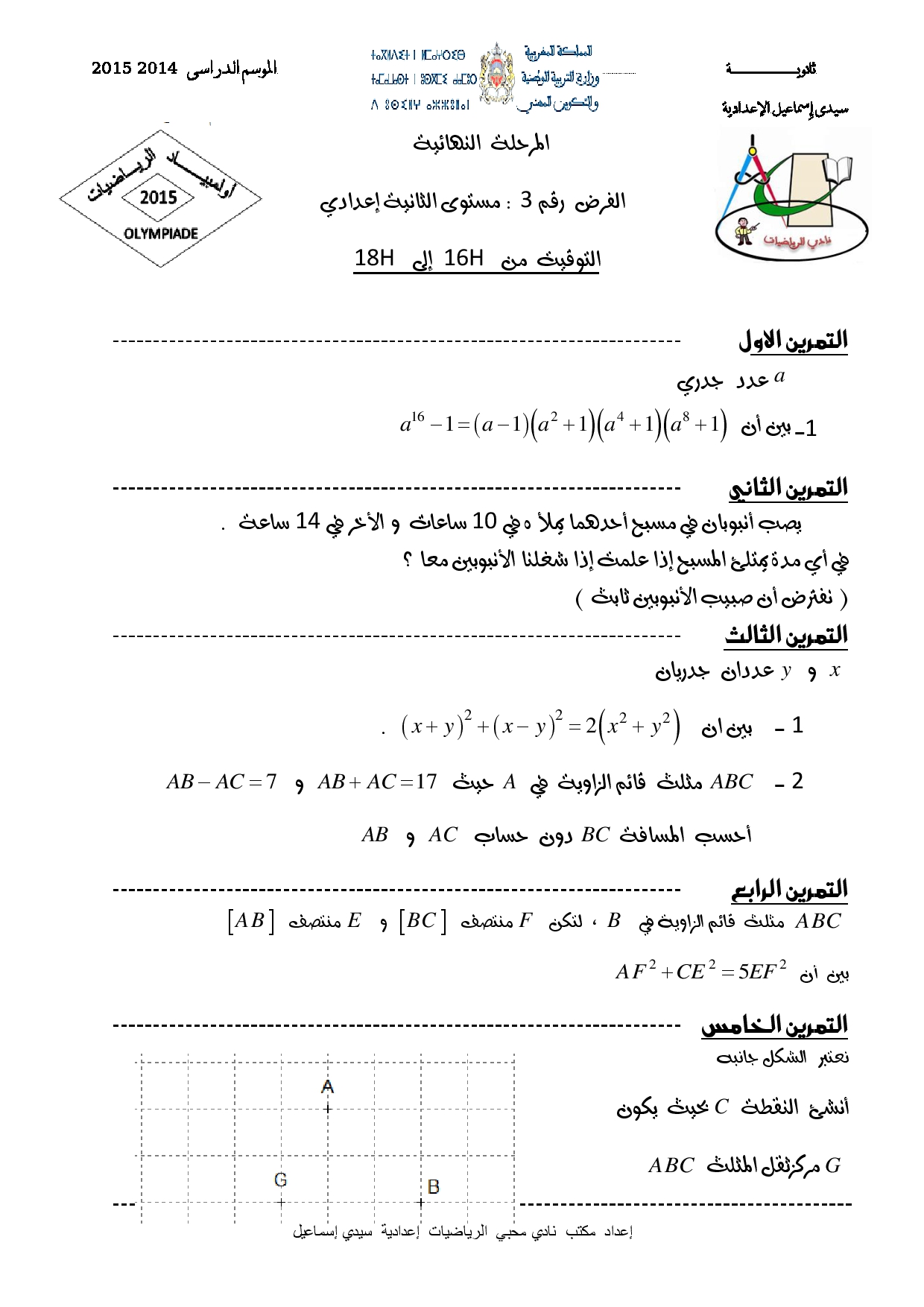 أولمبياد الرياضيات : المرحلة الرابعة | الثانية إعدادياولمبياد الرياضيات الثانية إعدادي اولمبياد الرياضيات الثانية إعدادي 2016-03-28Mouad Lakrad